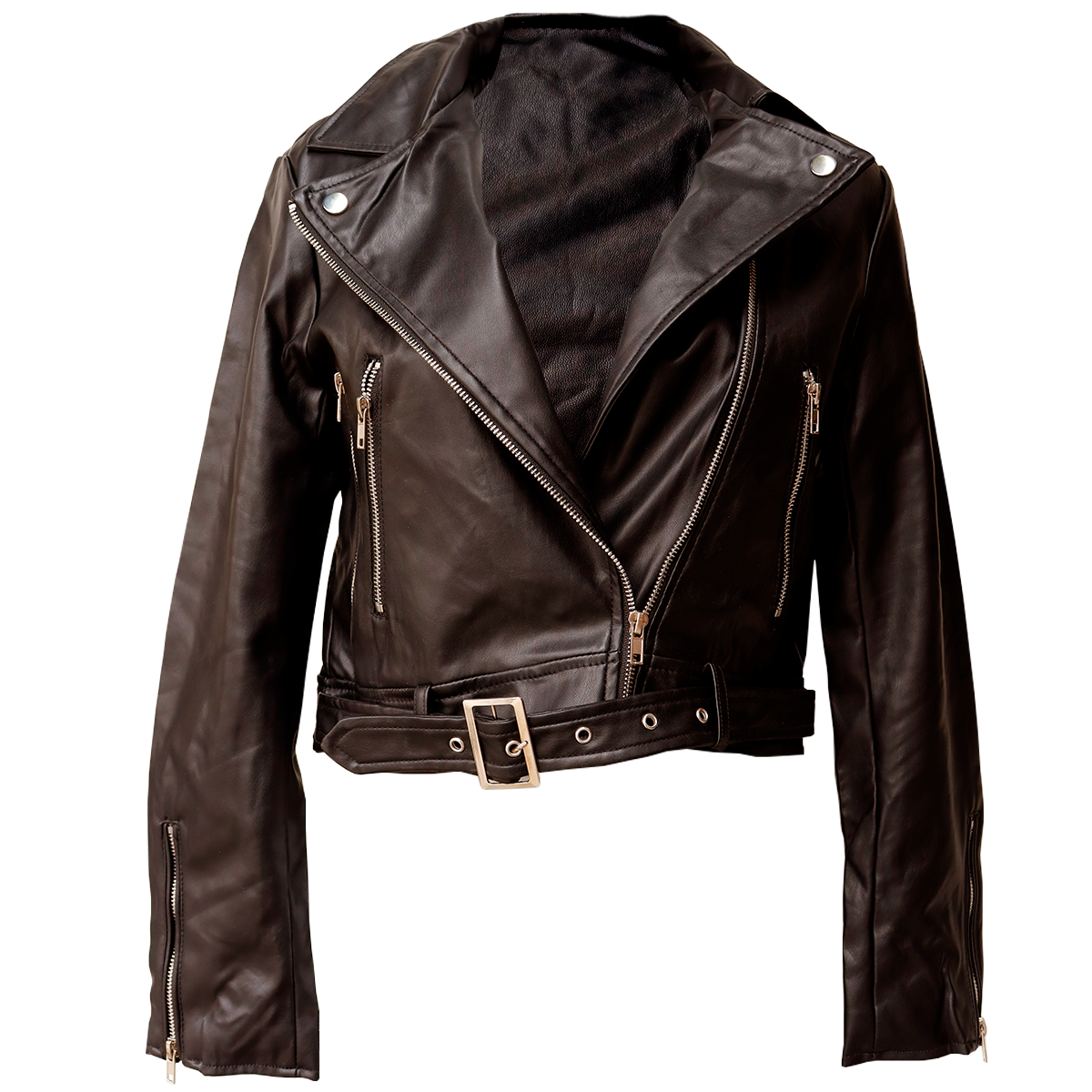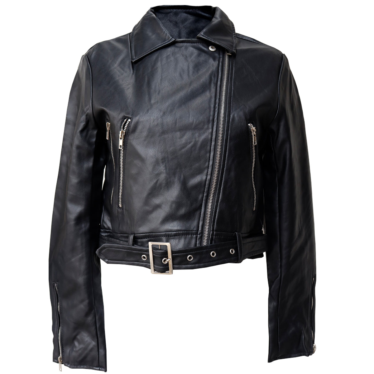 Chaqueta con diseño moderno tipo biker. Cuenta con cierre frontal metálico asimétrico, solapa clásica con botones de presión y bolsillos laterales con cierre. Incluye cinturón ajustable en la parte baja y cierres decorativos en las mangas para un estilo más versátil y atrevido.