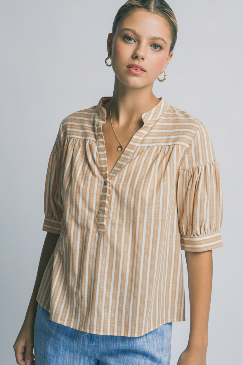 Patrón de Rayas Verticales: Líneas finas en color camel y blanco que estilizan la figura de forma sutil.