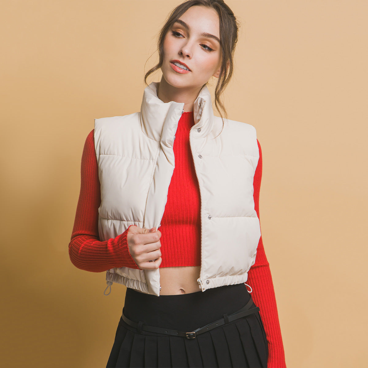 Este versátil chaleco acolchado reversible es perfecto para los días frescos con estilo. Confeccionado en tonos neutros que combinan con todo, ofrece dos opciones de color en una sola prenda. Cuenta con bolsillos funcionales en ambas caras, cierre frontal de cremallera y cordones ajustables en la cintura para un ajuste favorecedor.