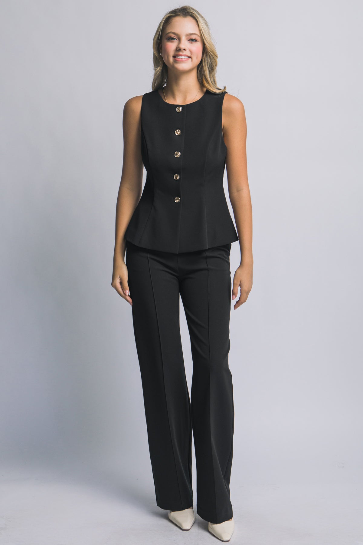 Chaleco Entallado con Peplum: El top presenta un corte entallado que se ensancha sutilmente en la parte inferior lo que ayuda a definir la cintura y suavizar la línea de la cadera.